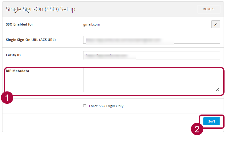 11. Return to the Emburse Cards SSO Setup window. Find the field labeled IDP Metadata. Copy the contents of the Google IDP metadata file into IdP Metadata field of the Emburse Cards SSO setup page, and click Save .