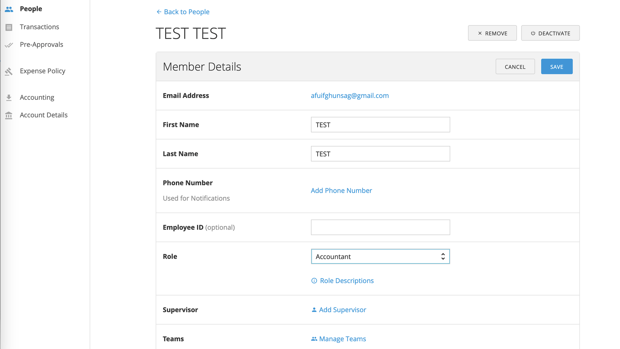 Only Emburse Cards users with Admin permissions can add, edit, deactivate, or remove users.
