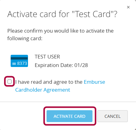Check the I have read and agree to the Emburse Cardholder Agreement option, and then select ACTIVATE CARD. |