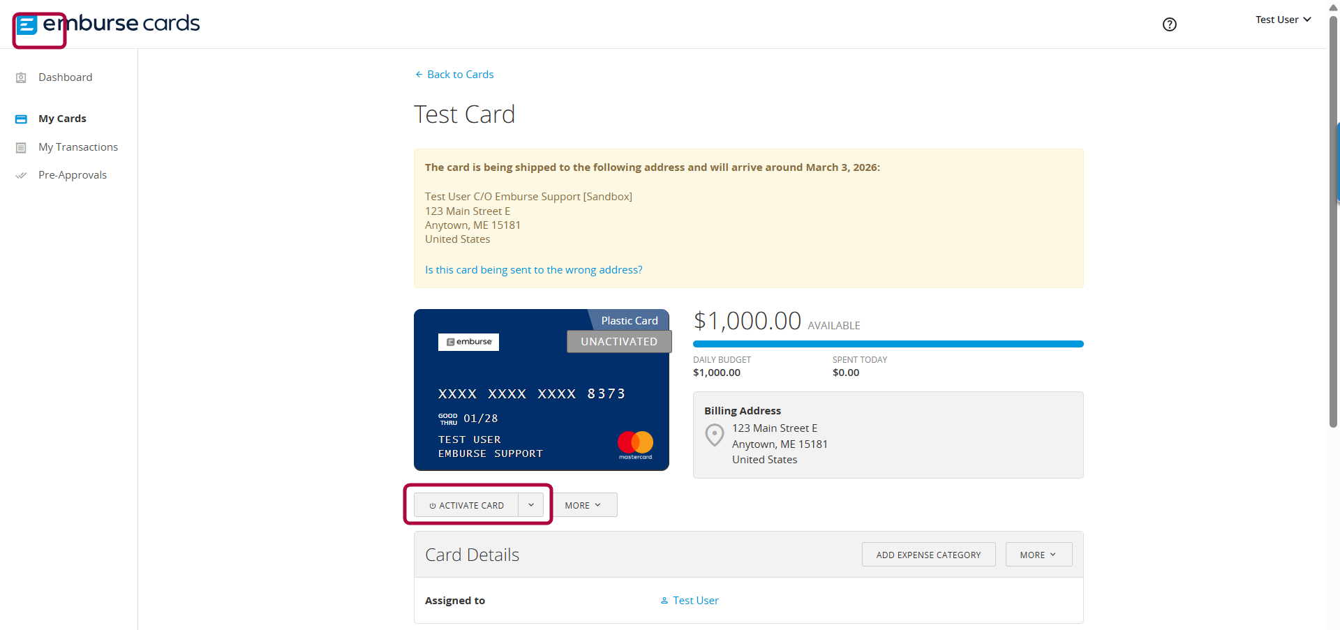 Confirm the card details and select Activate Card. |