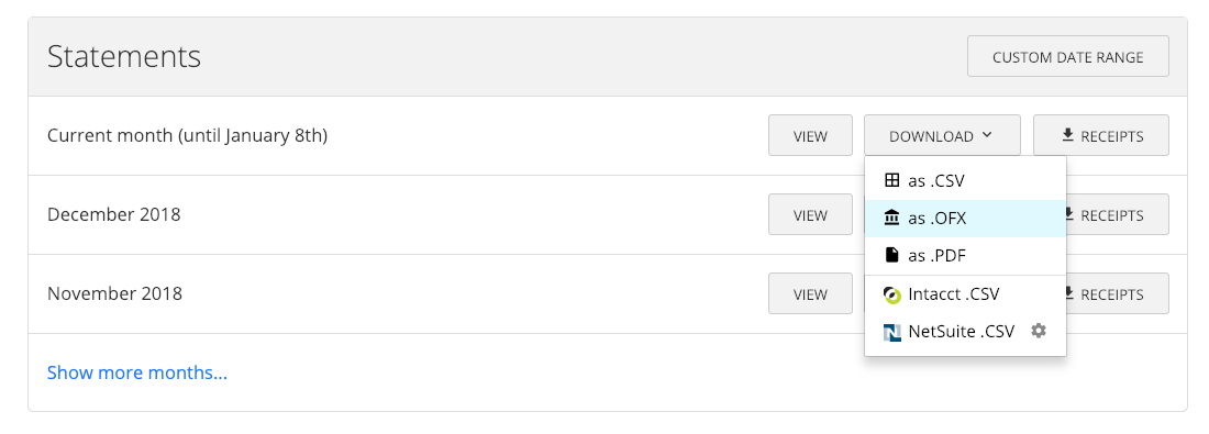 Under Statements, select Download for a month, or select Custom Date Range to export a specific time period. |