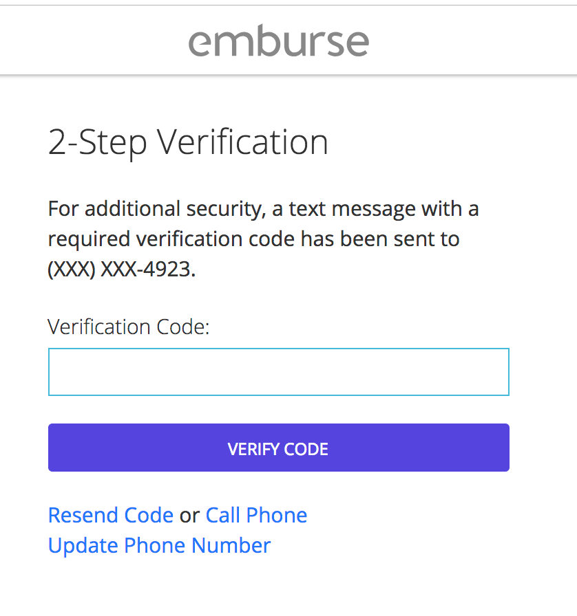 For additional security, Emburse Cards requires that users log in with both a password and a unique code from their mobile device. 2-Step verification is set up when the user first creates an account.