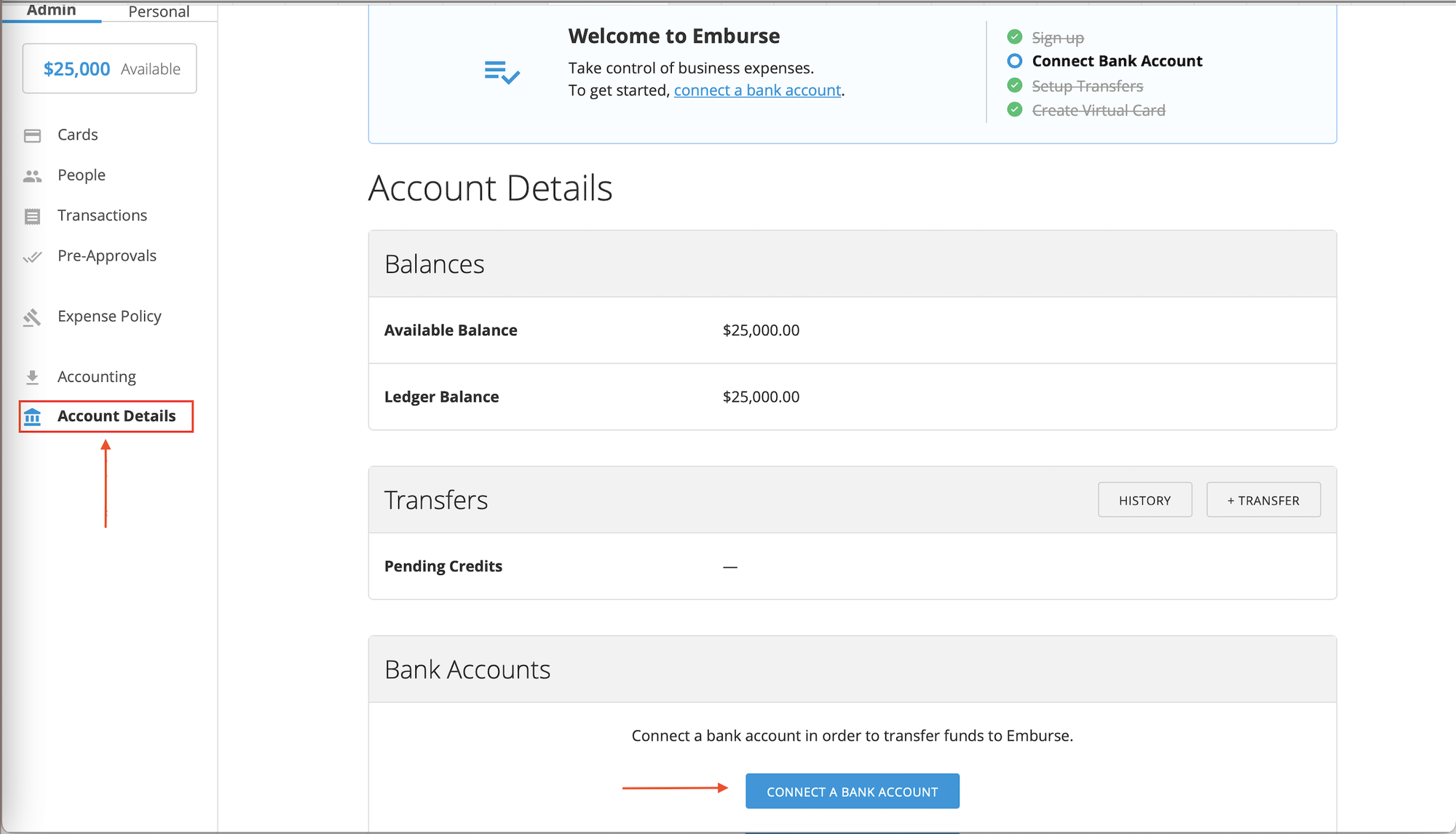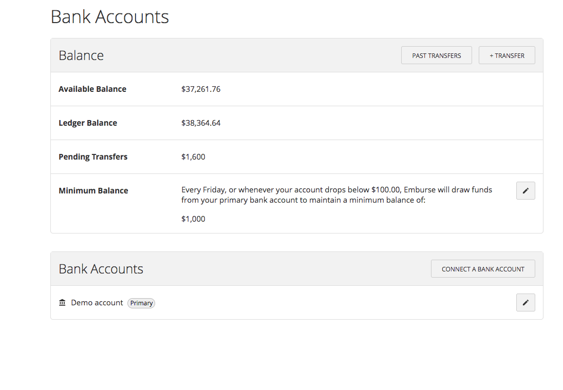 Once you've successfully connected a bank account, you'll see it on your Account Details page and you'll be able to transfer funds from the bank account into Emburse Cards.