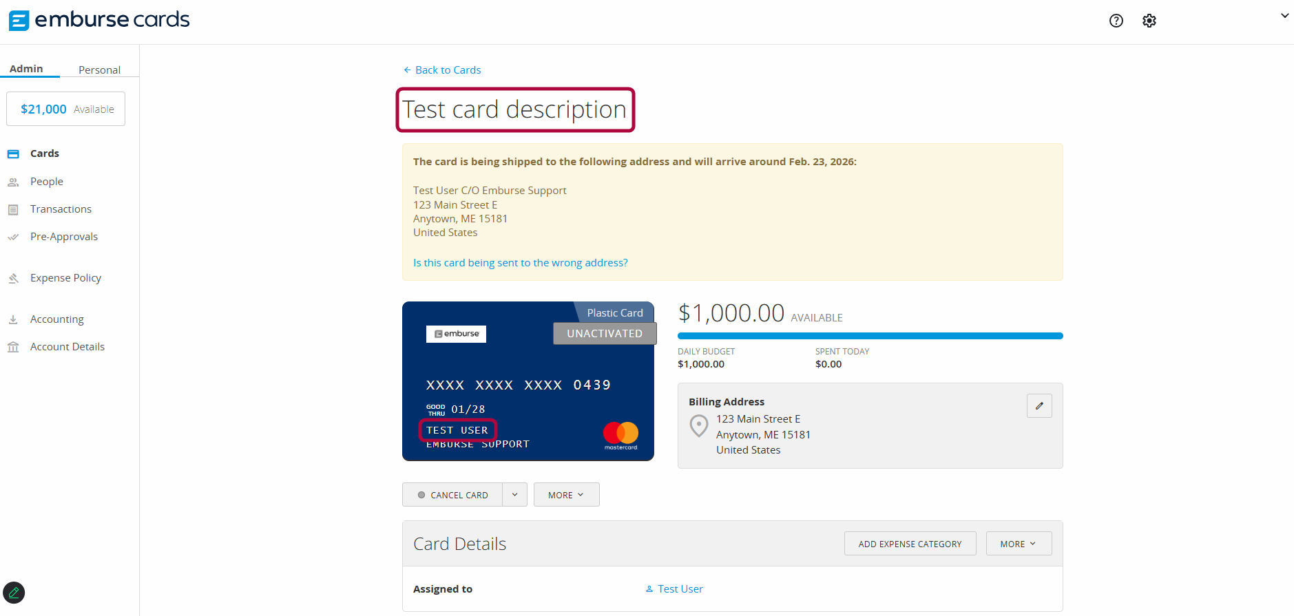 For physical cards, the printed name is the cardholder’s legal first and last name. The Card Description value displays in your account above the card, but it does not change what is printed on the physical card.