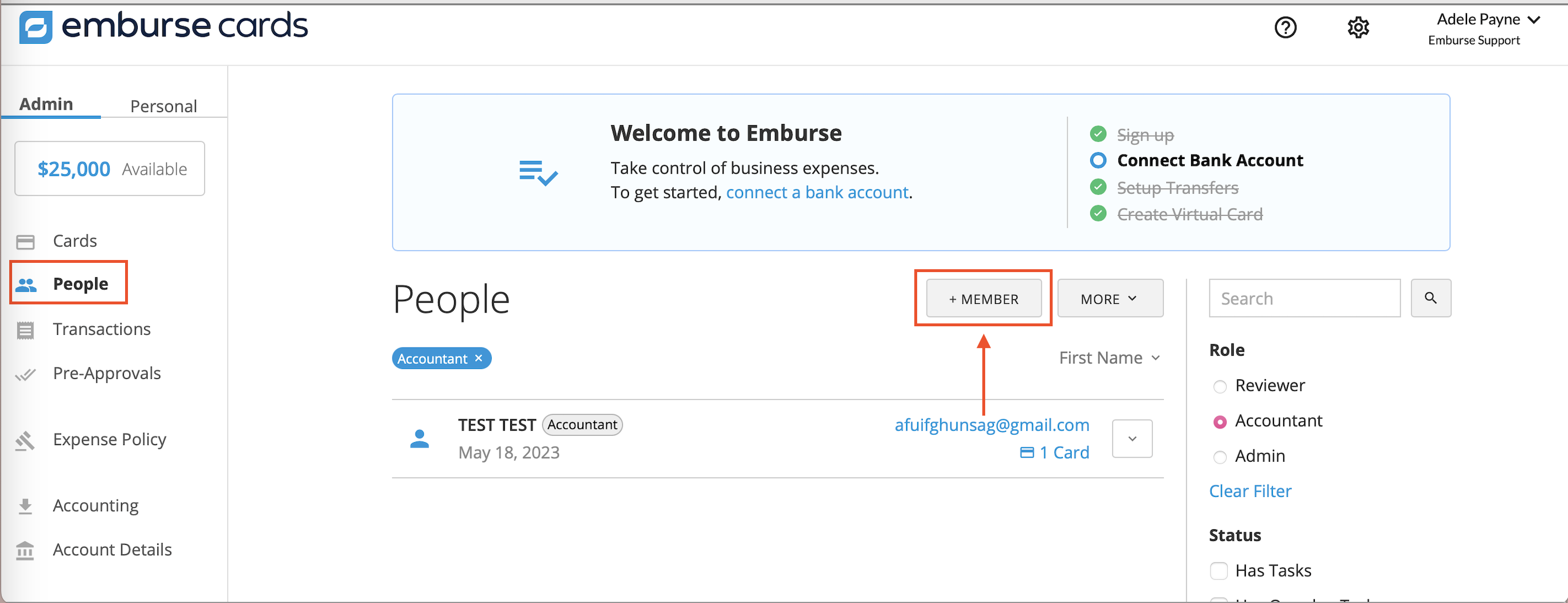 Owners and admins can click People under the Admin tab to add or remove a new member to your account.