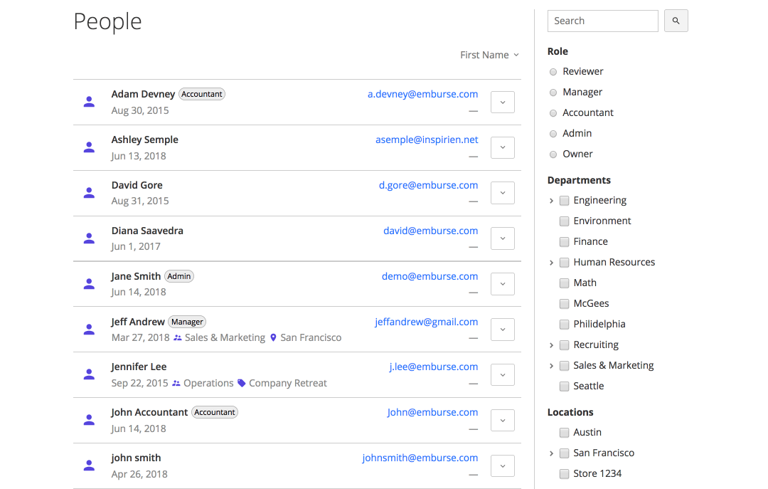 Use filters and search on the People page to quickly find members in your account. You can filter by role, custom fields (such as department), and location to narrow the list before making updates.