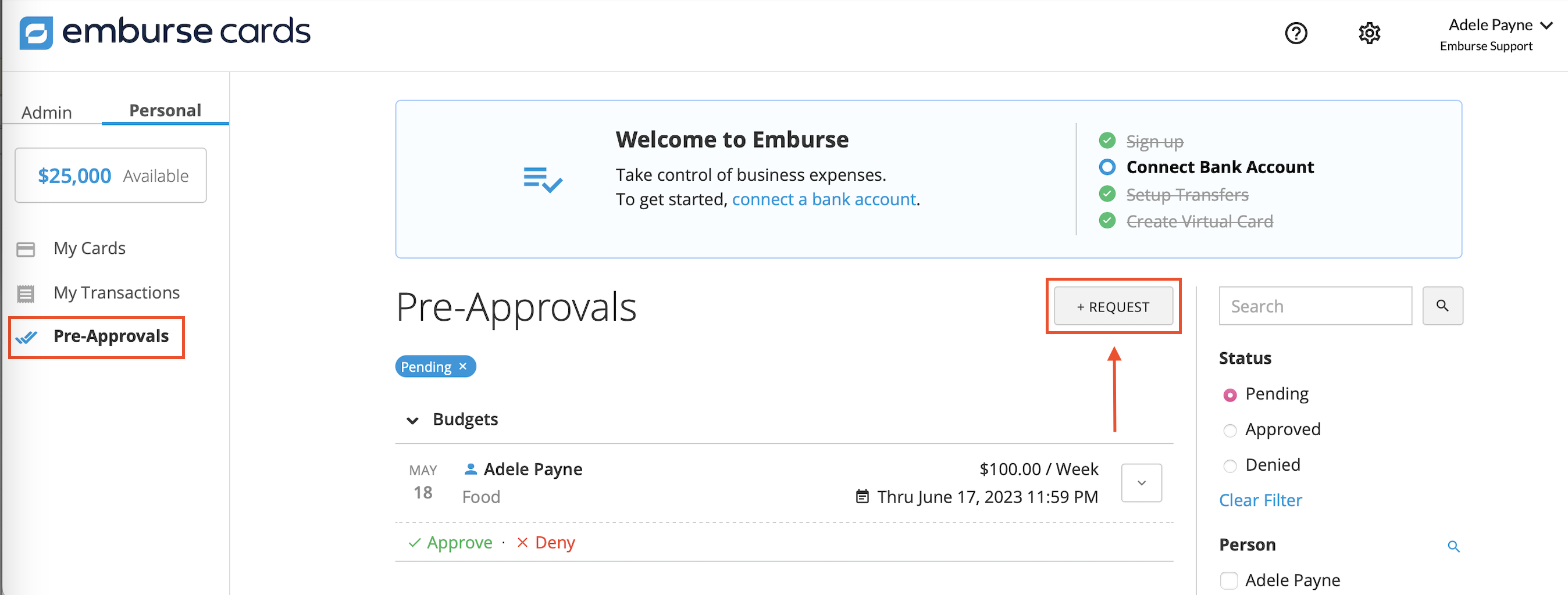 Any member of an account can create a purchase request by clicking the Pre-Approvals section under the Personal tab and + Request.
