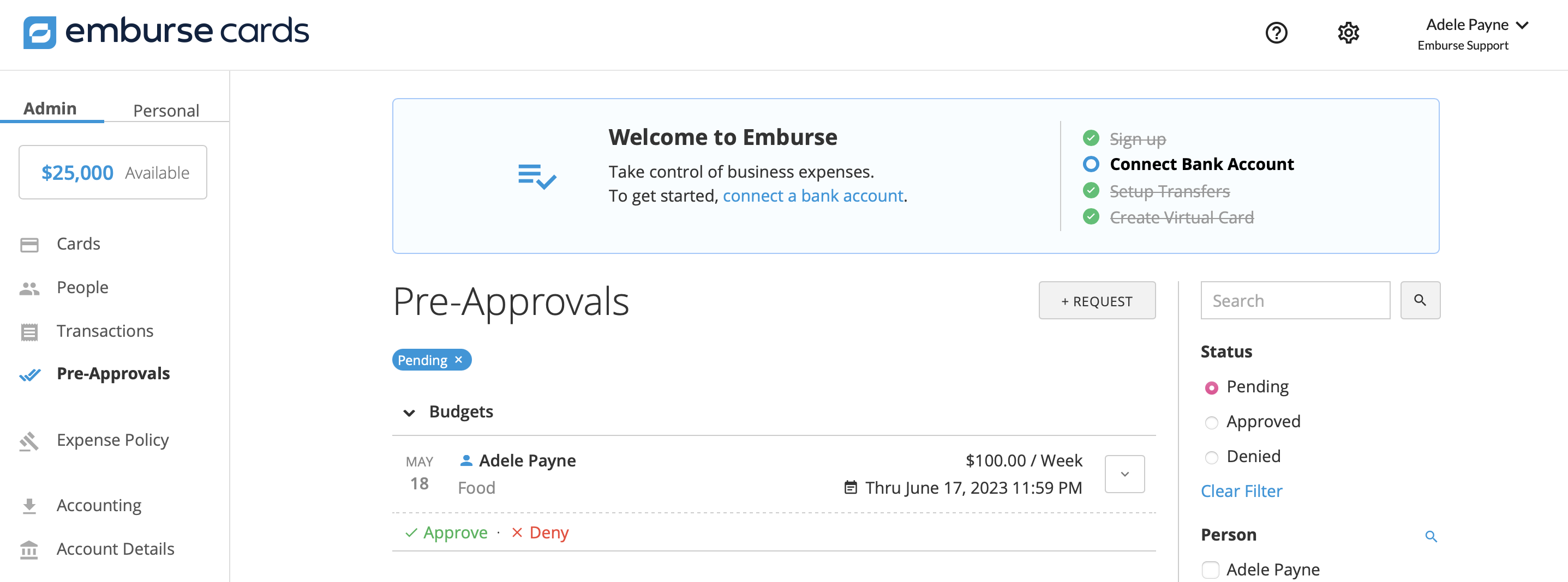 As an Admin, you can Approve or Deny pre-approvals and view a list of the current pre-approvals on the cards.
