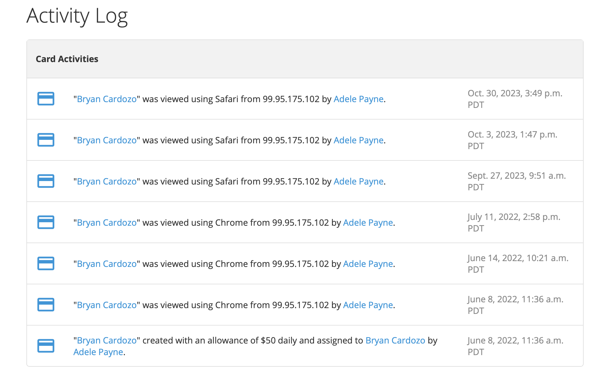 You will be able to see when the status of the card was changed, who changed it, and at what time. The activity log records changes like card status, spending restriction changes, who viewed the card, etc.