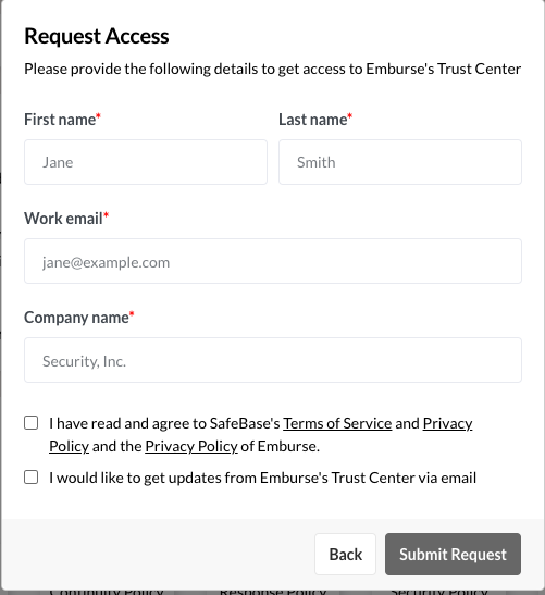 6. La solicitud será enviada al equipo de Seguridad de Emburse para su revisión. Si se aprueba, recibirá un correo electrónico con un enlace que podrá usar para descargar documentación desde el Centro de Confianza.