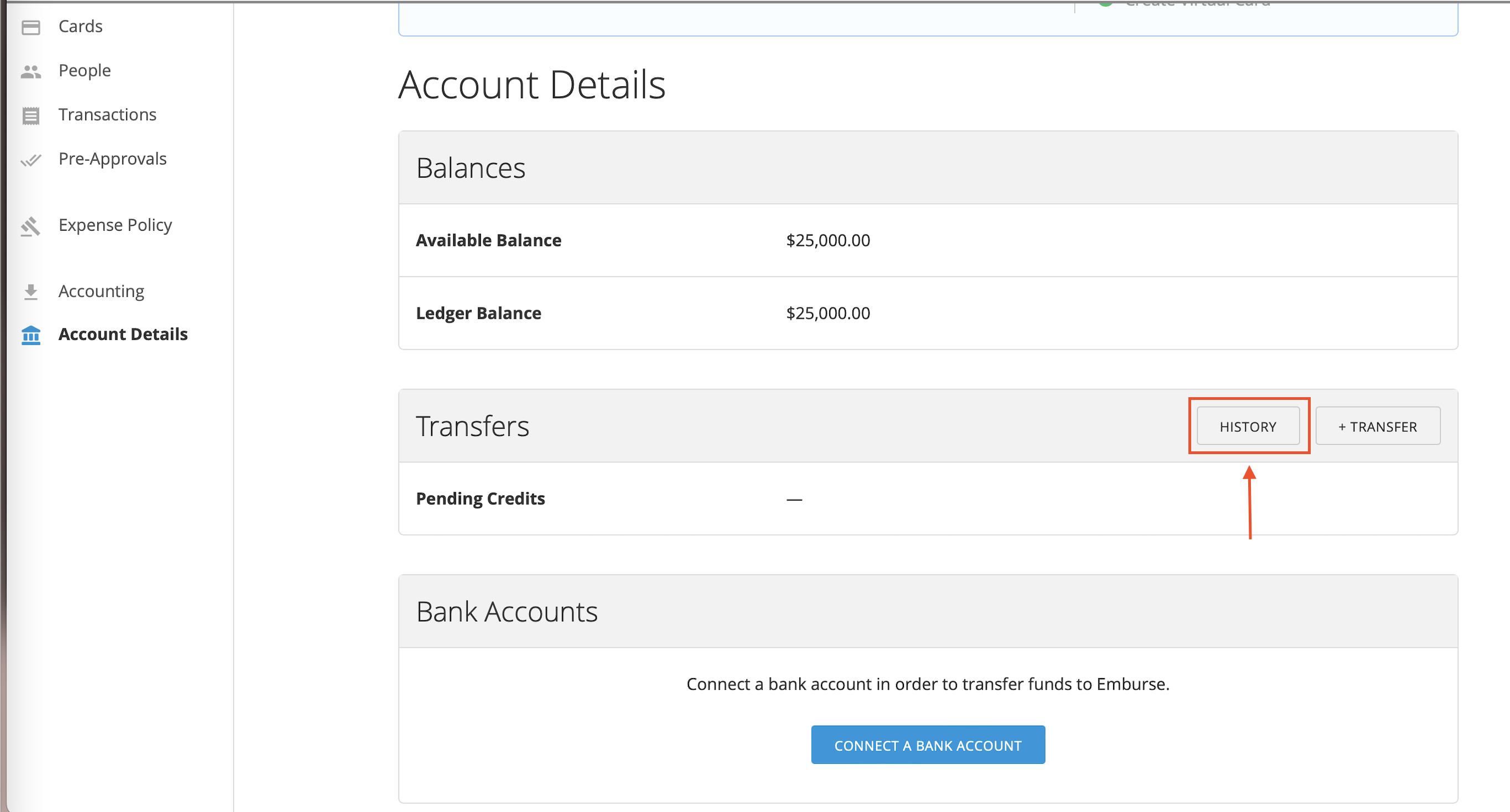 Haz clic en Historial para encontrar cualquier transferencia pendiente o transferencias pasadas en tu cuenta. Incluye cuenta bancaria, monto, fecha, memo (si se ingresó) y el nombre del administrador que realizó la transferencia si no tienes transferencias automáticas habilitadas.